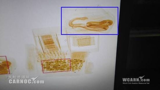 8日07:45,美蘭機場貨運部安檢員在檢查海口至上海航班申報名稱為衣服、文件等一批快遞貨物時,通過X光機判別圖發現一貨件疑似活體動物蛇的圖像。該批貨物申報品名填寫是衣服、文件等物品,怎么會顯示動物特征?當時安檢隊員感到很疑惑,為了排除疑點必須開包核查。于是,X光機操作員立即向安檢開包員發出開包指令,安檢開包員正對貨物進行開包檢查時,突然貨件里一麻袋裝有的東西在不斷激烈蠕動,當安檢員正要進一步細查時,蠕動的麻袋突然自動站立了起來,大約20CM高,同時袋子里傳出唧唧的聲音,安檢員立即判斷是某種活體蛇類動物,經與托運代理快遞公司確認,袋子里裝的確是一條眼鏡毒蛇。