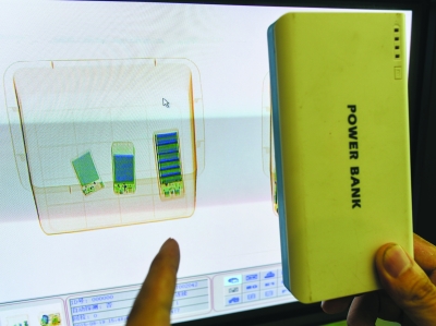 圖為安檢人員在安檢儀下解釋此類充電寶不合乎規(guī)定